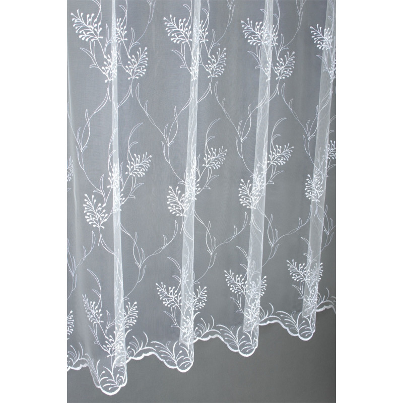 Záclona v metráži je jemná záclona s celoplošným vyšívaným vzorem, jemnou strukturou větviček.